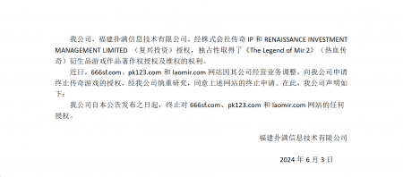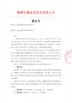 福建撲滿信息技術(shù)有限公司注冊地位于福建省福州市,是國內(nèi)《熱血傳奇》客戶端游戲獨占性版權(quán)人。對《熱血傳奇》客戶端游戲擁有全部版權(quán),并有權(quán)基于版權(quán)權(quán)利進(jìn)行該游戲維權(quán)。株式會社傳奇IP (以下簡稱傳奇IP )對《The Legend of Mir 2》(中文名為“熱血傳奇"、或“傳奇”、“傳奇2”、“MIR II”)游戲(以下稱為 “授權(quán)作品”) 共同享有充分、完整且有效的著作權(quán)。經(jīng)傳奇IP授權(quán) , RENAISSANCE INVESTMENT MANAGEMENT LIMITED (以下簡稱 RENAISSANCE Ltd.)有權(quán)在中國大陸地區(qū)獨占性地對授權(quán)作品的網(wǎng)絡(luò)客戶端游戲進(jìn)行開發(fā)、 發(fā)行、管理、宣傳、推廣和運(yùn)營,針對授權(quán)作品的侵權(quán)游戲及侵權(quán)方,RENAISSANCE Ltd.有權(quán)采取必要的措施,并有權(quán)將前述權(quán)利分授權(quán)給第三人。福建撲滿信息技術(shù)有限公司經(jīng)RENAISSANCE Ltd.授權(quán),獲得上述權(quán)利,有權(quán)在中國大陸地區(qū)獨占性地對授權(quán)作品的網(wǎng)絡(luò)客戶端游戲進(jìn)行開發(fā)、發(fā)行、管理、宣傳、推廣和運(yùn)營,并有權(quán)對侵權(quán)行為/主體采取維權(quán)措施。